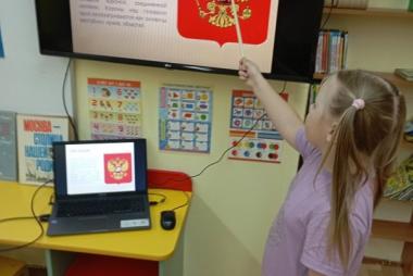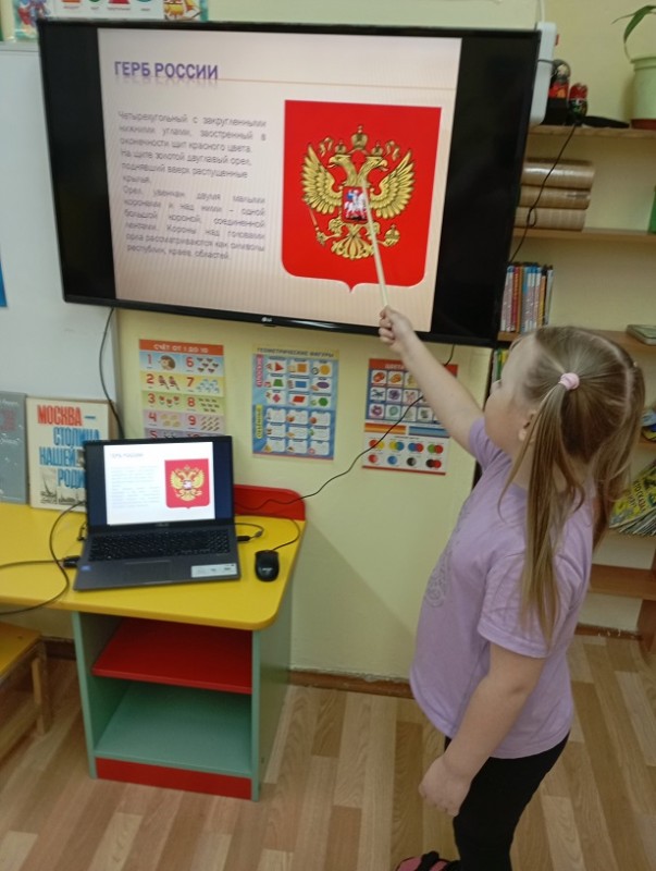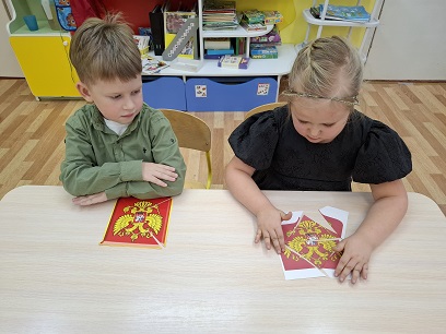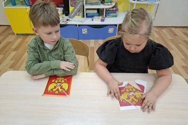 Ребята подготовительной группы "Рябинка" (воспитатель Генкель Светлана Юрьевна) закрепили символы Российского государства. Государственный символ, который представляет из себя красный геральдический щит с золотым двуглавым орлом, утвержден указом президента в последний день осени 1993 года-герб России.