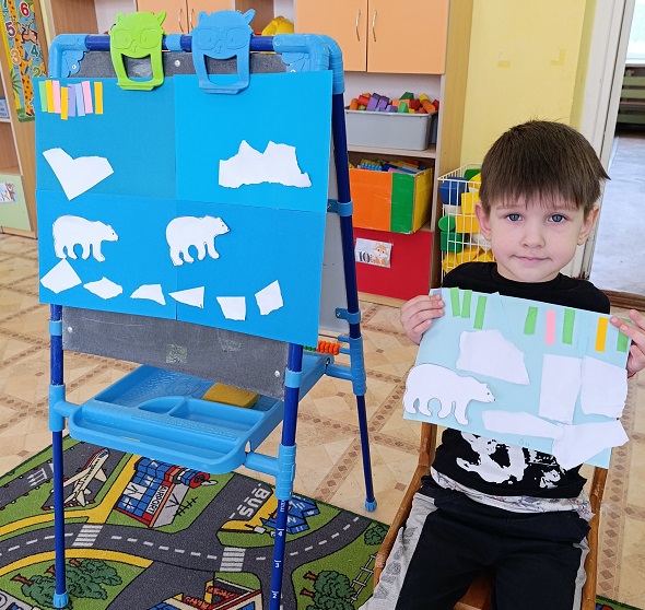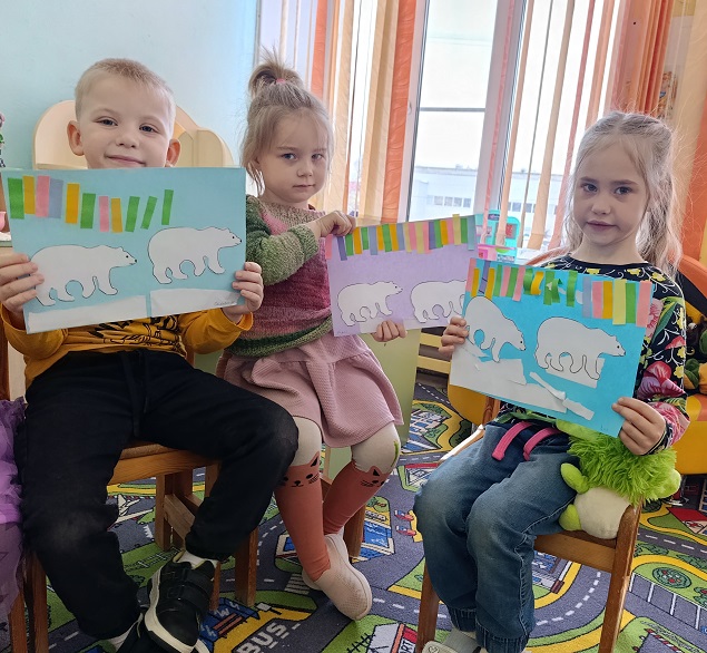 В старшей группе " Ягодки" ( ул. Урицкого, 30А) ребята узнали, кто такой полярный медведь, почему проводится экологическая акция в его защиту: он занесён в Международную Красную книгу и Красную Книгу России. Под руководством воспитателя Арефьевой Надежды Сергеевны дети выполнили творческую работу в технике аппликации .