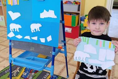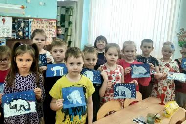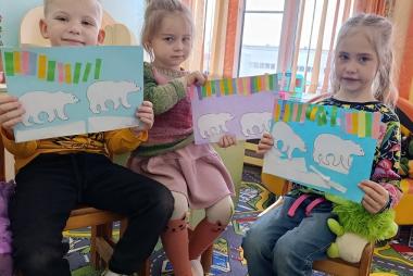 С ребятами средней группы "Солнышко" воспитатель Романова Наталья Анатольевна провели увлекательную беседу о том, что далеко на Северном полюсе живут белые медведи. Мы посмотрели увлекательный видеофильм о жизни белых мишек. Ребята узнали чем питаются медведи, чем отличаются от наших бурых мишек. В завершении беседы мы сделали интересную аппликацию"Белые медведи и северное сияние".