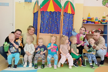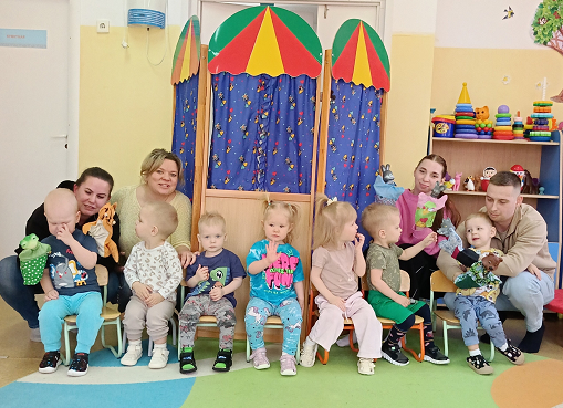 В группе раннего возраста «Солнышко» (ул. Урицкого, 9) завершился проект «Весенняя неделя театра». Вместе с воспитателем Великсар Ксенией Михайловной дети знакомились с театром , примеряли на себе роли зрителей и артистов, с удовольствием рассматривали иллюстрации знакомых сказок, лепили щечки «Колобку». Слушали сказки : «Репка», «Теремок», «Курочка Ряба», «Колобок», потешки: «Гуси, гуси», «Ехали, ехали» и другие. В завершении проекта, родители показали кукольный спектакль «Теремок» ! Дети были в восторге и отблагодарили артистов громкими аплодисментами. Театр – волшебный край, в котором ребенок радуется, играя , познает мир.
