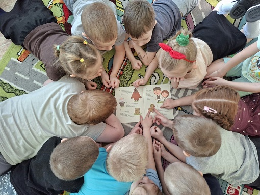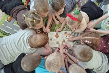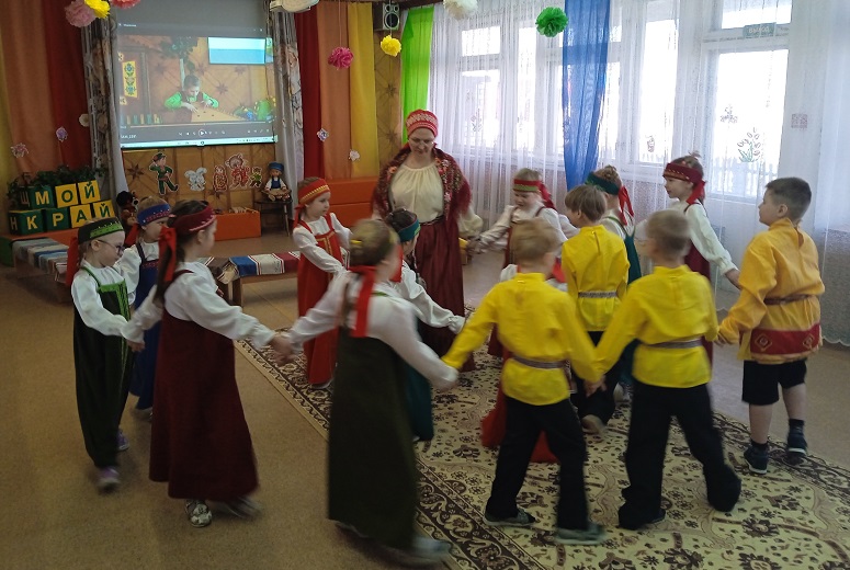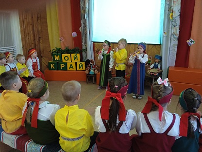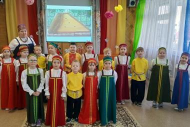 Дети подготовительной группы «Затейники» (ул. Володарского, 39) играли в игру "Карелию в «Букве «К»». Нарядные дети пришли на мероприятие в народных Костюмах, играли на народных инструментах под звуки Кантеле, исполнили песни на карельском языке «Kevätpajo», «Čiučoin pajoine» и танец «Круугу».