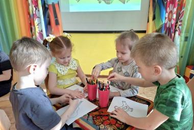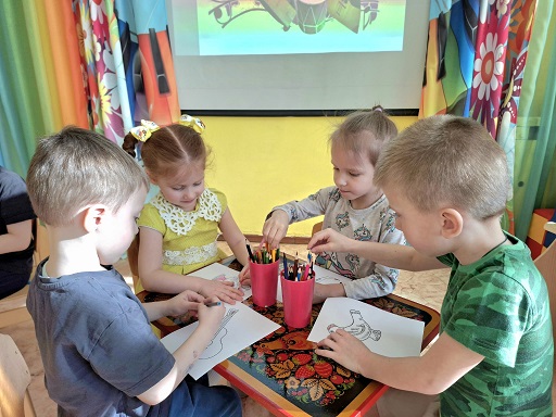 Дети подготовительной группы «Непоседы» (ул. Красноармейская, 26А), войдя в зал в народных костюмах, поразили яркостью красок. Раскраски с изображением народных инструментов стали интересным сюрпризом для ребят.