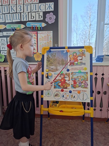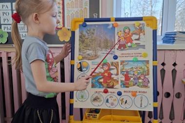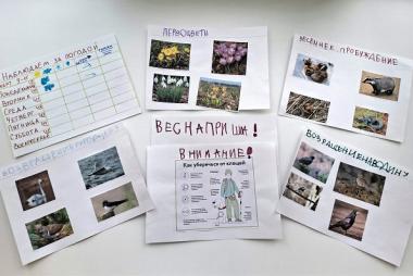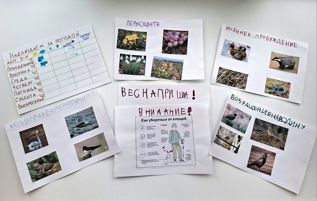 Дети наблюдают и отмечают изменения, происходящие вокруг: солнышко светит ярче; снег тает, появляются лужи, а с крыш нависают сосульки; воздух стал прозрачнее и свежее; птицы суетятся и шумят. Ребята рассматривали иллюстрации о весне. С помощью интерактивной презентации узнали о животных, просыпающихся из спячки, о первоцветах и перелётных птицах, которые возвращаются на родину. На прогулке мы наблюдаем за изменениями в природе и отмечаем их в календаре наблюдений.