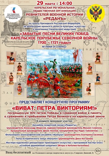 Уважаемые родители! 29 марта 2026 года в 14 .00 в зале Олонецкого Центра творчества и досуга по адресу ул. Свирских Дивизий, д.2 состоится патриотическая концертная программа "Виват, Петра Викториям!", посвященная 305-летию Победы в Северной войне в память о сражениях и пребывании Петра Великого на карельской земле.